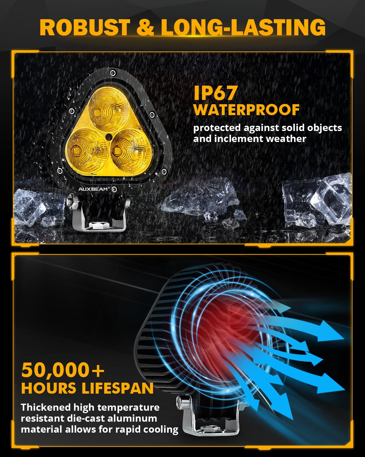 HIGH INTENSITY COMBO LIGHT : Auxbeam led amber fog lights built in 70w super led chips. Latest refraction cups designed as flood beam inside and spot beam outside create a unique 40° spot beam, the LED pods provide extremely bright fog lights for long distance and broader coverage at any scenes | RAPID COOLING AND ADJUST MOUNTING SHELL: 4 inch amber offroad lights pod Aluminum alloy shell deaign for fast and effectively cool down the heat for best off road lighting performance.The sturdy U shape stainless mounting brackets can be adjusted according to your needs to change the fog lights direction | IP 67 Waterproof Rating: Which means that a 4-inch amber fog lights can be use in rain or snow. yellow offroad lights adopt Lower Power Consumption technical. It meets the IP67 international standard, feture with waterproof, dustproof and shockproof | WIDE APPLICATION: Auxbeam amber offroad lights widely used for almost all Off Road Vehicles, ATVs, UTVs, SUVs, Construction Vehicles, Farm Vehicles, Wrangler, Trucks, Motorcycles, Buses, Pick-ups, marine, Boat, etc. Many indoor and outdoor uses: Garden Lighting, Backyard Lighting, Back-up Light, Off Road Lighting, Construction Lighting and so on. Working voltage of 12-80V | PACKING & SERVICE: 2 x 70W led amber fog lights, 2 x necessary mounting brackets, 1 x 2 lead wiring harness. If you have any problems during installation, please feel free to contact us, we will provide you with perfect after-sales service