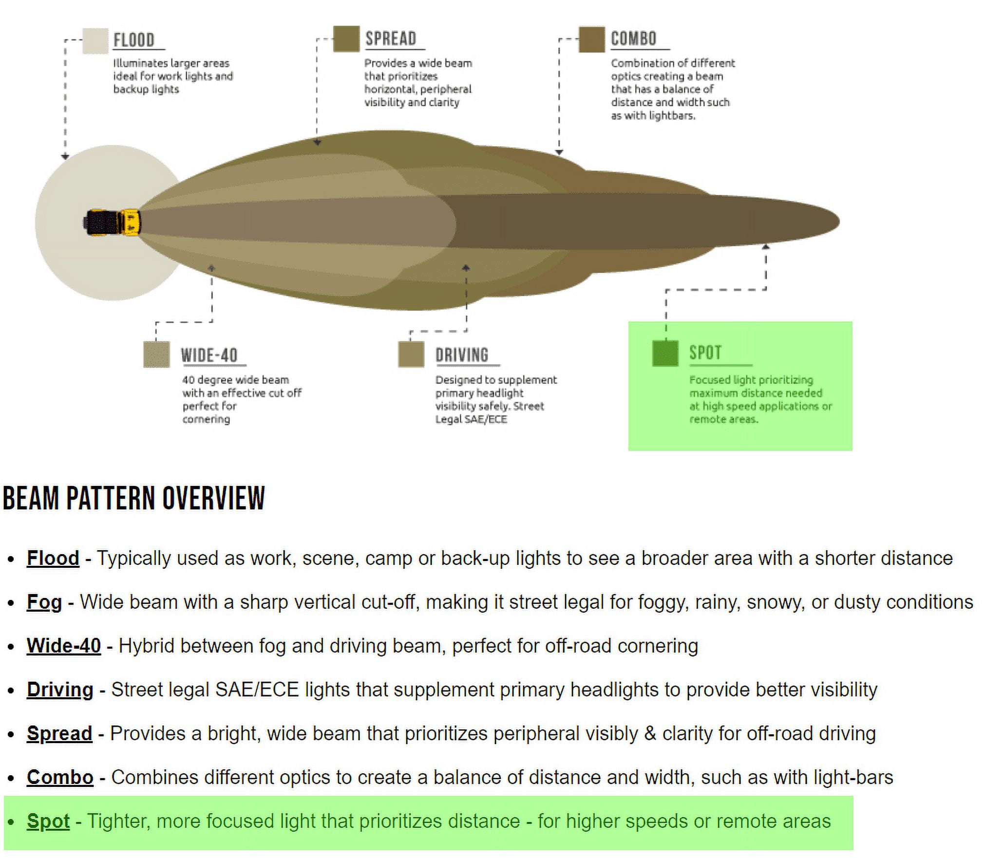 Spot Beam- Provides focused bright light for maximum forward distance and high speed visibility.